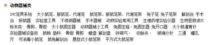 IVC笼具系统 大小鼠笼、豚鼠笼、代谢笼 鼠笼架、豚鼠笼架、代谢笼架 兔子笼 兔子笼架 解剖台 手术台 斩鼠器 实验室工具 不锈钢器械 手术器械 动物实验常用工具 生理药理实验仪器 生物显微波片标本类 骨剪、骨钳 大小鼠固定器 动物器械小工具 兔固定箱·兔固定器 兔开口器 大小鼠灌胃针实验器械设备类 鼠粮 垫料 骨钳 骨剪 蜡盘 解剖盘 锌铜弓· 动脉夹· 玻璃分针 三通 瞳孔尺 可消毒小鼠笼 鼠兔解剖台 悬挂式小鼠笼架 平方式大鼠笼架